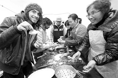 图为近日希杰(左一)和巴汉姆(左二)在江苏南通和平桥街道北濠东村社区向居民学习包饺子。