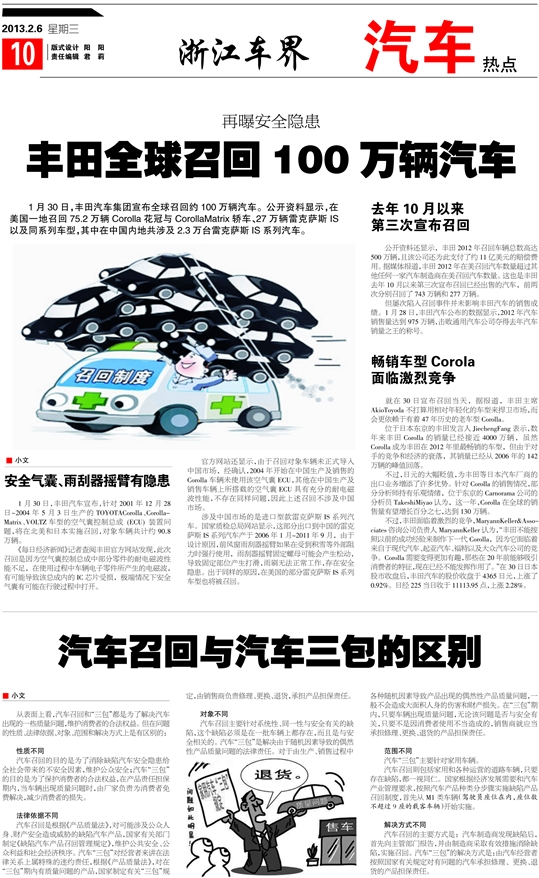 汽车召回的主要方式是:汽车制造商发现缺陷后,首先向主管部门报告,并由制造商采取有效措施消除缺陷,实施召回。汽车“三包”的解决方式是:由汽车经营者按照国家有关规定对有问题的汽车承担修理、更换、退货的产品担保责任。