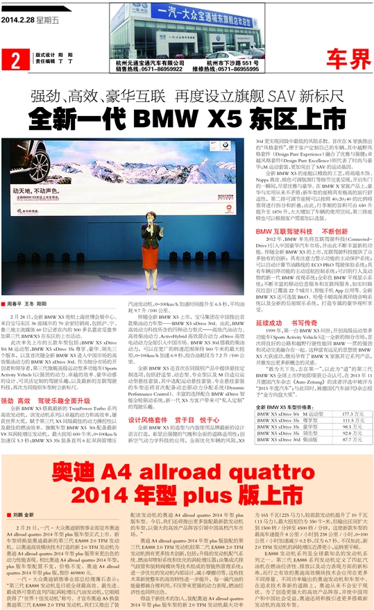 一汽-大众奥迪销售事业部总经理薄石表示:“第三代EA888发动机是目前全球最高效、最先进、最成熟可靠的直列四缸涡轮增压汽油发动机,它刚刚获得了‘世界十佳发动机’称号。才宣布奥迪A5换装奥迪第三代EA888 2.0 TFSI发动机,我们又推出了装配该发动机的奥迪A4 allroad quattro 2014年型plus 版车型。今后,我们还将推出更多装配最新款发动机的车型,以强大的高效产品阵容引领中国高档汽车市场。”