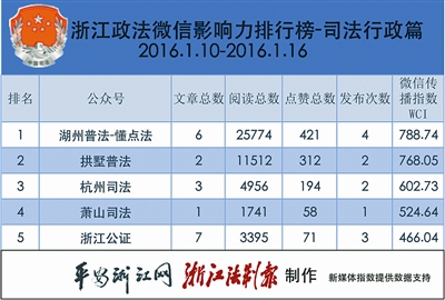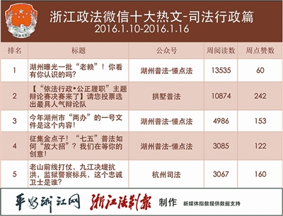 再看热文榜,“湖州普法-懂点法”也是“来势汹汹”,前十中占据6席。其中,《湖州曝光一批“老赖”!你看有你认识的吗?》以周阅读数13535获第一。“老赖”话题总是那么吸引人。