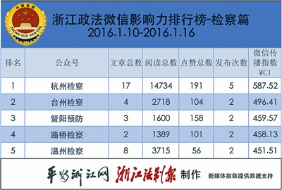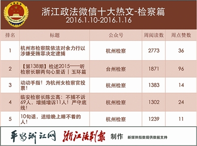 再看热文榜前十名, “杭州检察”一家占据了7席,小编简直惊呆了!其中,《杭州市检察院依法对余力行以涉嫌受贿罪决定逮捕》以周阅读数2773获第一名。上榜的7篇文章中,有政务信息、人物对话、心灵鸡汤等等。看来找对受众口味,增加阅读数不再是难题。