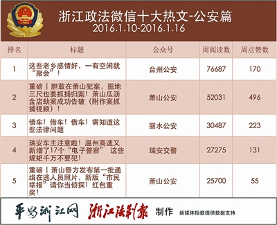 再看热文榜,“台州公安”的《这些老乡感情好,一有空闲就“聚会”!》以周阅读数76687获第一名。看了内文小编才知道,这些老乡是在赌桌上培养“感情”的,文章还配了现场抓捕图片,实在精彩。另外,“萧山公安”在前十热文榜单中占据4席。