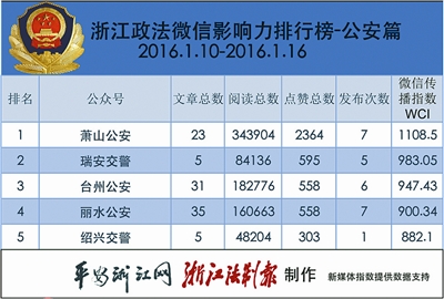 公安榜,“萧山公安”和“瑞安交警”坐稳上周第一、二名。“台州公安”“消失”了两期后,重新“杀回”榜单,夺下第三名。值得一提的是,“萧山公安”继上期之后,仍是唯一一家在公检法司4家榜单中微信传播指数超过1000的,可喜可贺!小编也注意到,“瑞安交警”的微信传播指数也在上升,与“萧山公安”的差距很小哦!