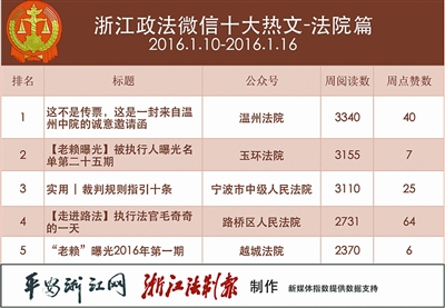 热文榜,“老赖”主题降温。“温州法院”的《这不是传票,这是一封来自温州中院的诚意邀请函》以周阅读数3340获第一。小编心得,线上报名、线下活动,这封邀请函掀开了法院的神秘面纱,也助力了阅读数。