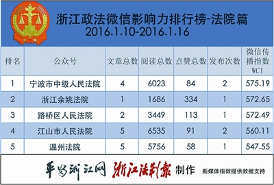“宁波市中级人民法院”和“浙江余姚法院”这期终于冲进前列,分获第一、二名。第三名由近几期成绩较为稳定的“路桥区人民法院”获得。前三名的微信传播指数非常接近,这名次啊就差0.16。
