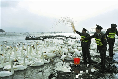 山东荣成市俚岛镇烟墩角村是大天鹅越冬的重要栖息地,俚岛边防派出所民警每年都守护着近千只天鹅。图为昨日,民警为雪天觅食困难的大天鹅补充饲料。