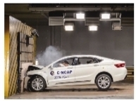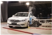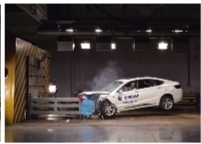 在正面40%重叠碰撞测试中,吉利博瑞以64km/h的速度与刚性壁障发生碰撞,整车向右后方倒退,前引擎舱溃缩变形,防撞梁变形,左纵梁变形,A、B、C柱无明显变形,左右前车门能正常开启,不影响驾乘人员迅速打开车门自救逃生。同时前后排假人坐姿均正常,没有出现“下潜”现象,安全气囊正常打开,安全带紧扣。