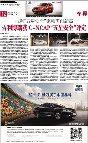 浙江法制报 浙江车界 00033 吉利博瑞获C-NCAP“五星安全”评定 2016-01-20 2 2016年01月20日 星期三