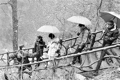 本报讯 庆元县万里林派出所被称作全省海拔最高的派出所。在海拔1500多米的百山祖上,抗冰雪形势就更严峻。近日,派出所的7名民警组成突击队加强山间巡逻,图为民警在易发险情的百瀑沟指引早前上山的摄影发烧友下山。