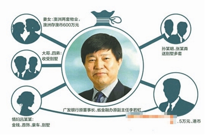 据广东省国资委纪委官方微信号“粤国资清风”披露,经广东省纪委调查,广发银行原董事长、省金融办原副主任李若虹在任广发银行副行长、行长、董事长期间,涉嫌利用职务便利为他人谋利,收受他人贿赂共计人民币1440.8万元、港币408.6万元;还涉嫌收受他人巨额财物,合计人民币1944.7万元、港币1342万元、美元300万元。文章称,其累计收受贿赂超过5000万人民币,而且违反社会主义道德,与他人长期通奸。