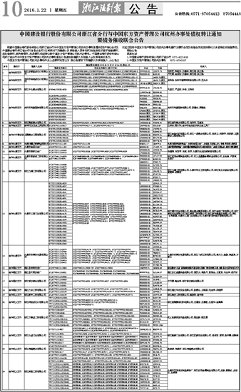 中国建设银行股份有限公司浙江省分行与中国东方资产管理公司杭州办事处债权转让通知 暨债务催收联合公告