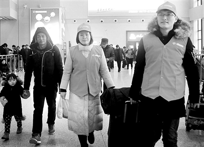 春运开始了,金华市启动“信义金华 春运暖冬”志愿服务活动。1月24日至2月5日期间,每天将有50余名志愿者出现在金华高铁站、普铁站的自售机导购、实名制验票、安检、出口引导、服务台等岗位,提供引导咨询、秩序维护、重点帮扶、便民利民、应急救援等服务,为旅客铺设温暖、平安的回家路。图为志愿者引导旅客进站并帮忙拿行李。