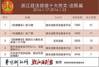 再看热文榜,年底,“老赖”话题更是热门。“丽水法院司法服务平台”的《第16期》、《第17期》两篇“老赖”文分别以7682、4400的周阅读数位居第一、第二。第三名也与“老赖”有关,是“玉环法院”的《【老赖曝光】被执行人曝光名单第二十六期》。在这里,小编只想对“老赖”们说一句:要想过个安心年,就赶紧还钱吧!