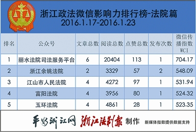 本期法院榜单上基本都是“老面孔”。“丽水法院司法服务平台”持续发力,状元实至名归;“浙江余姚法院”发挥稳定,仍居榜眼;“江山市人民法院”较上期提升一个名次,荣获探花,可喜可贺。
