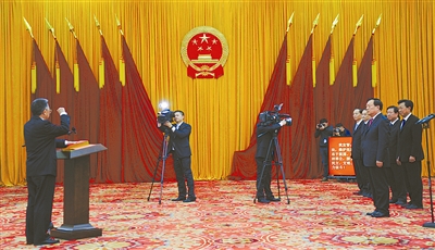 1月28日下午,雄壮的国歌声拉开了宪法宣誓的序幕:省十二届人大四次会议选举产生的9名国家工作人员,身着正装,依次走上宣誓台,面向国徽,左手抚按《中华人民共和国宪法》,右手举拳,庄严宣誓。