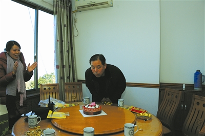 按照景区分局惯例,每位民警生日的时候,单位都会送上一份生日蛋糕,因为当天早上金爱忠上岗早,他错过了早餐的生日面,中午又不知道什么时候才能撤岗,所以在中午短暂休息的时候,分局政治处把这个蛋糕送到了临时指挥部。在临时指挥部,蛋糕端上来的时候,金爱忠的视线还紧盯着指挥用的对讲机。吹灭蛋糕上的蜡烛后,金爱忠就匆匆离开了指挥部,赶往上香现场,因为午饭过后,又将有大批香客到来……