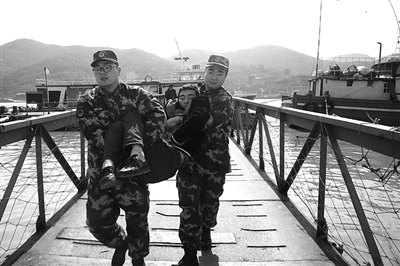 | 边防官兵将患者抬往码头 |