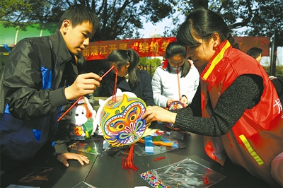 2月18日,温州龙湾区蒲州街道蒲江社区举办制作灯笼、猜灯谜和垃圾分类游戏等活动。图为志愿者正在指导市民制作灯笼。
