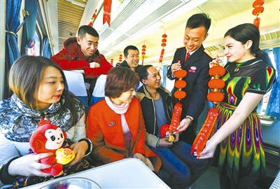 当日,由长春开往乌鲁木齐的T302次旅客列车上举办了一场“元宵佳节喜乐会”,长春客运段的乘务员与旅客猜灯谜互动,共同进行文艺表演,在车厢里营造喜庆的节日气氛。