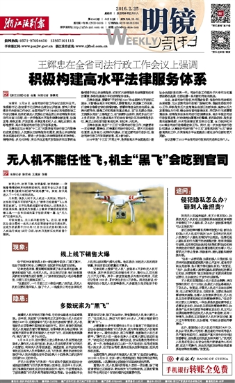 浙江法制报 一版要闻 00001 无人机不能任性飞,机主“黑飞”会吃到官司 2016-02-25 2 2016年02月25日 星期四
