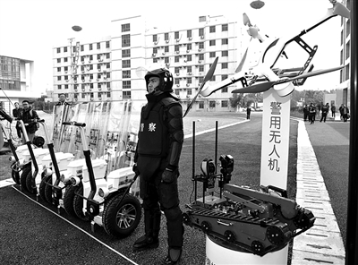 | 警用无人机、特警穿着防暴服 周尔博 摄 |