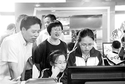 市委610办主任施国强、萧山区委副书记裘超参观反邪教警示教育基地,观看青少年玩“智勇斗邪教”游戏。