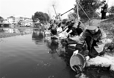 昨天,德清县禹越镇中心学校的30多名学生代表,将18000多尾花鲢鱼苗投放到家乡的母亲河——西公港,用实际行动带动周围的人,共同参与爱护母亲河。