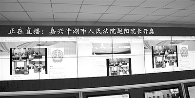 | 平湖法院对一起案件进行互联网视频直播,该院大屏幕也同步直播。 |