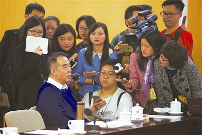 图为全国政协委员陈凯歌(前左)在小组讨论间隙接受媒体记者采访。