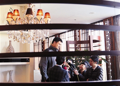 3月9日,全国政协委员姚明在全国政协十二届四次会议小组会议间隙接受采访。
