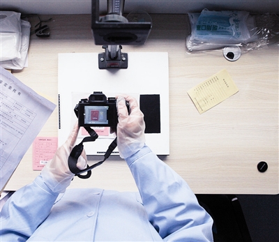 这是警察序列中的一个神秘领域,色彩单一,蓝、白、灰构成了工作环境的主基调;静谧,恒温恒湿,一件件样本送进来,又“走”出去,最终化作图形、数字、符号永远地“定格”在纸面上,呈现在细节中。