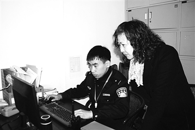 | 民警帮助蒋女士(右一)查找好心人吴先生的信息 |