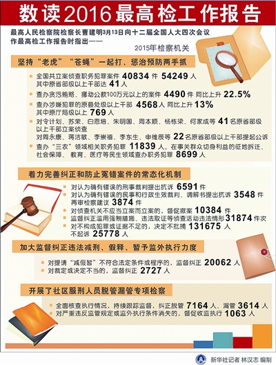 关于2016年检察机关工作安排,曹建明说,一是坚持把防控风险、服务发展摆在更加突出的位置,保障创新、协调、绿色、开放、共享发展;二是下大力气破解难题、补齐短板,切实提高维护国家安全和社会稳定的能力水平;三是坚持有腐必反、有贪必肃不动摇,推动形成不敢腐、不能腐、不想腐的有效机制;四是强化对诉讼活动的法律监督,维护宪法法律权威;五是深入推进司法改革;六是打造过硬检察队伍,提升严格规范公正文明司法水平。
