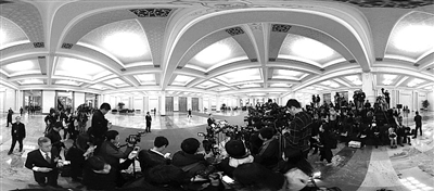 | 记者在人民大会堂“部长通道”采访(全景相机拍摄) 新华社 王建华 摄 |