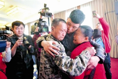 | 被拐18年的资阳男孩黄忠与父母拥抱在一起 |