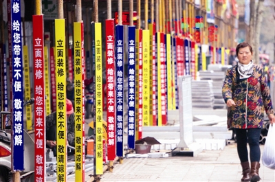 昨日,杭州火车东站附近的天成路沿街,多处迎G20峰会外立面装修施工现场,脚手架贴上了五颜六色的标语,上面写着:“立面装修,给您带来不便,敬请谅解。”让行人感到路边施工的文明。