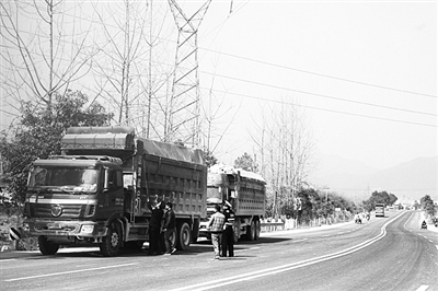 近日,常山县矿产资源管理办公室、交通运输局、交警大队和农业局等部门联手,在常辉线进行为期2个月的路面集中检查,进一步整治涉矿产品车辆超限超载和“跑冒滴漏”现象。图为检查现场。
