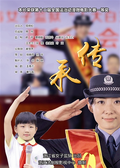“我的妈妈是一名狱警,从小我就无法理解妈妈一心扑在服刑人员身上……”10岁女孩站在学校的主席台上,说着自己妈妈的故事,不知不觉泪眼婆娑。但在亲历过妈妈帮助服刑人员狱中产子,感受到妈妈对服刑人员真心的付出,10年后的她也穿上了警服……影视中心成立之初,就和浙江省女子监狱合作,拍摄制作了这部由真实故事改编、讲述监狱人民警察如何忠于职责与使命的微电影《传承》,用精心打磨的剧本加上女监民警及警属的本色演出,这部片子感动了无数人,并荣获了第十二届全国法治动漫微电影大赛微电影竞赛单元一等奖。