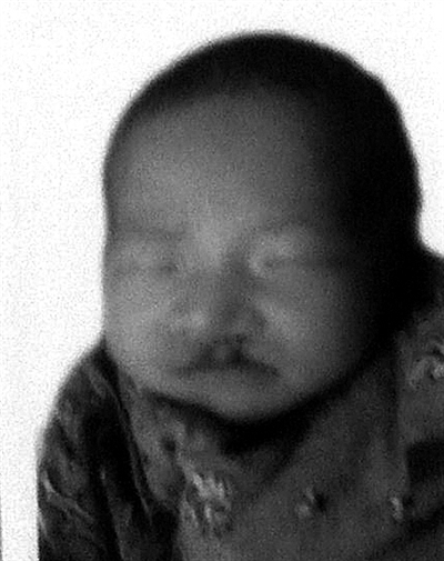 某男孩,2012年4月1日出生(估),2013年12月10日19时,在金华市青春路老年公寓门口(福利院)捡拾。随身有旧衣服若干、小垫毯。患有唐氏综合症。