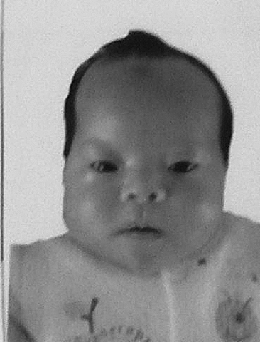 某男孩,出生日期2013年10月25日(估),2013年11月24日在东阳市白云街道十里头社区十里头村王志球家门口被捡拾,唐氏综合征。