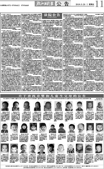 浙江法制报 公 告 00011 关于查找弃婴和儿童生父母的公告 2016-03-25 2 2016年03月25日 星期五