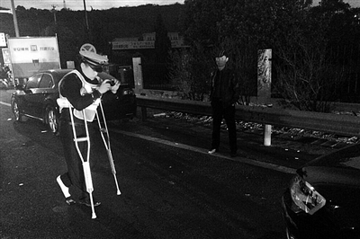 4月1日傍晚,高速上车流量已逐渐增大。陈女士开车途经上三高速时不慎与其他车辆发生刮擦,随后她驾驶车辆到嵊州出口处理事故。让她意外的是,前来处理事故的交警竟然拄着拐杖,“我刚把车开到出口处,有辆警车开过来,副驾驶位上下来一位交警,拄着双拐,他的一只脚上还缠着绷带。”陈女士回忆说。