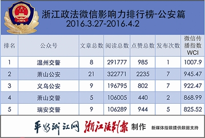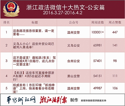 热文榜中,“温州交警”的《这条路况信息很重要,请一定要看……》轻松夺冠,文章对瓯海大道施工路段交通限制情况进行了深入解读,不仅为车主们带来了各种驾车攻略,还借机展示了交警很拼很萌的风采,周阅读量“10万+”不在话下。“义乌公安”的《义乌人小心!这些外贸公司已被列入黑名单!》位居亚军。