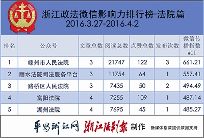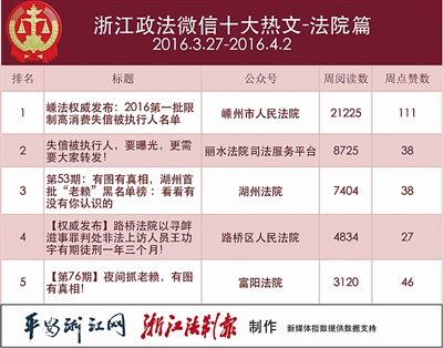 黑马夺冠的“杀手锏”是一篇“权威发布”——《嵊法权威发布:2016第一批限制高消费失信被执行人名单》。这招很管用,周阅读数直奔2万多。“丽水法院司法服务平台”则以一篇《失信被执行人,要曝光,更需要大家转发!》拿下热文榜第二。