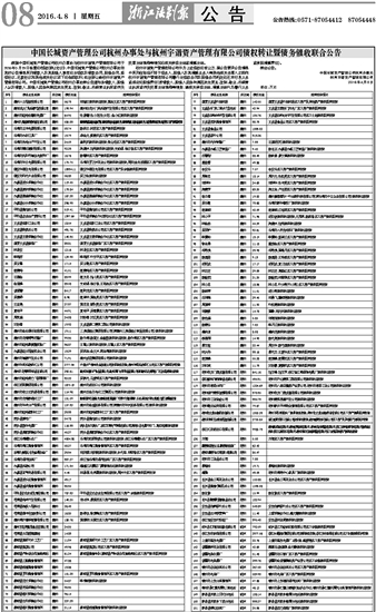 中国长城资产管理公司杭州办事处与杭州宇谐资产管理有限公司债权转让暨债务催收联合公告