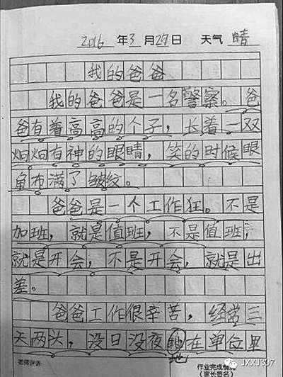 本报讯 前些天,一篇题为《我的爸爸》的日记在网上热传,日记中的“爸爸”被形容成“工作狂”,每天都忙得没时间陪女儿……原来日记中的“爸爸”是一名警察——海宁市公安局刑侦大队大队长胡飞,她的女儿叫朵朵,今年9岁。