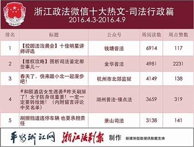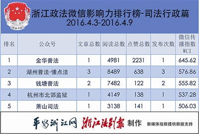 本期榜单的冠军改名换姓,“金华普法”由上期季军荣升冠军,“湖州普法-懂点法”由第四升至第二,第三名由“掉线”许久的“钱塘普法”获得。