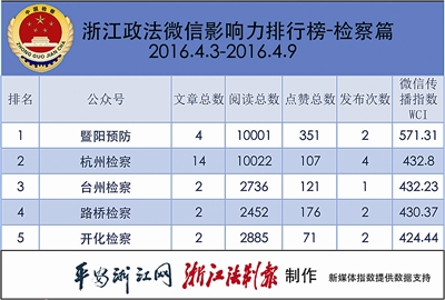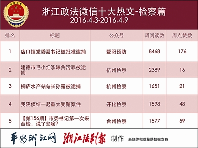 在热文榜中,“暨阳预防”同样给力,《店口镇党委副书记被批准逮捕》一文以8468的点击量排行第一,遥遥领先。虽然第二三名都是“杭州检察”的文章,但仍然抵不住“开挂”的“暨阳预防”。