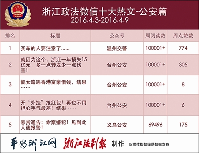 再来看热文榜,一开始小编以为是自己眼花了,本期热文榜前四名的周阅读量都在100000+以上,更令人惊讶的是,除了冠军“温州交警”的《买车的人要注意了………》,其余3个位次由“台州公安”包揽,分别是《就因为这个,浙江一年损失15亿元,多一点转发少一点伤害!》《靓女路遇香港富豪借钱,结果……》和《开“外挂”抢红包!再也不用担心手气最差!结果……》。小编细细读了几遍,发现这几个标题都设置了悬念,结果这一招成为点击量狂飙的法宝。