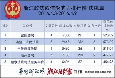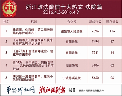 热文榜中,依然是“老赖”的市面。“诸暨市人民法院”的《我来爆,你来转,第二期老赖黑名单权威发布!》和富阳法院的《【老赖曝光】围观围观!快来看看有没有你认识的!》分获冠亚军。由此可见,读者对“老赖”的关注度持久不衰啊!